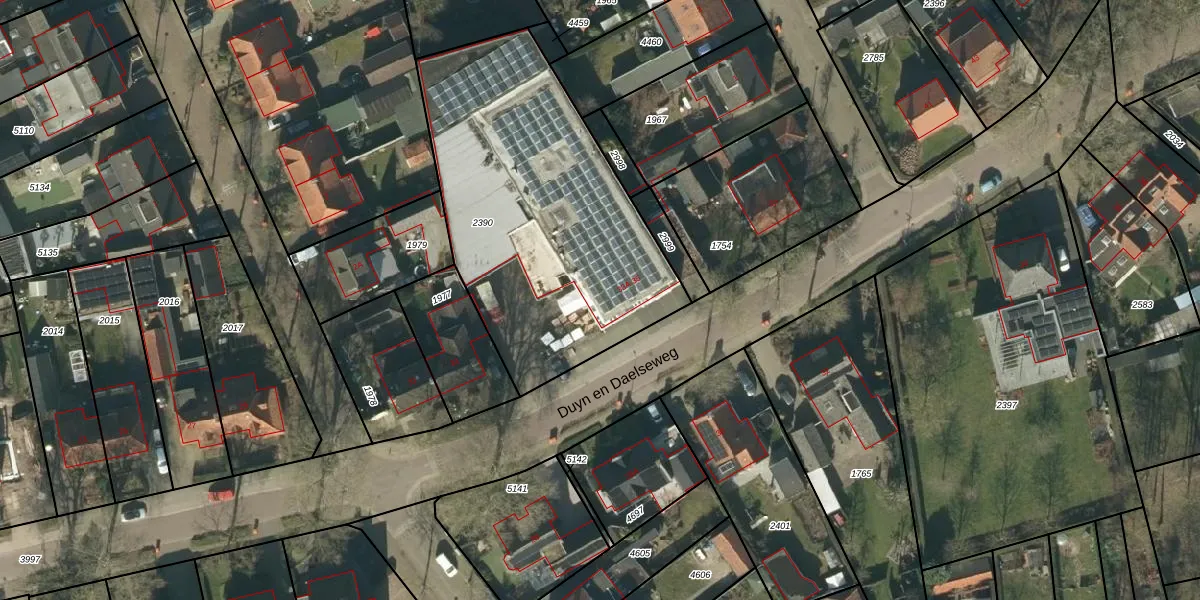 Het perceel waarop Duyn en Daelseweg 33-A staat heeft een oppervlakte van 1565 m². Dit is een zeer groot perceel. De perceeloppervlakte wordt geregistreerd door het Kadaster. Gedetailleerde informatie over de maten van dit perceel kunt u vinden in het rapport Kadastrale kaart met maatvoering van Duyn en Daelseweg 33-A.