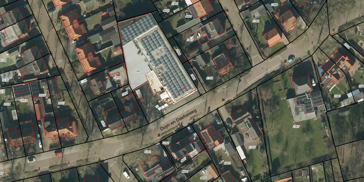 Het perceel waarop Duyn en Daelseweg 35 staat heeft een oppervlakte van 1565 m². Dit is een zeer groot perceel. De perceeloppervlakte wordt geregistreerd door het Kadaster. Gedetailleerde informatie over de maten van dit perceel kunt u vinden in het rapport Kadastrale kaart met maatvoering van Duyn en Daelseweg 35.