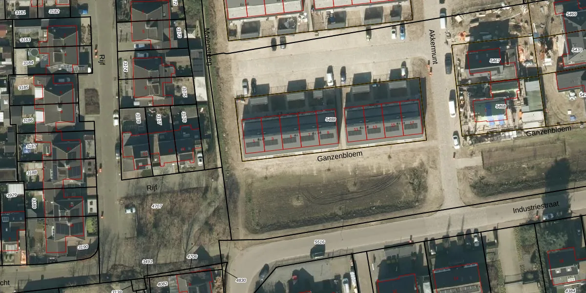 Ganzenbloem 5 is gelegen op kadastraal perceel NLD03B5488. Deze kadastrale aanduiding is uniek en wordt gebruikt door het Kadaster om eigendomsrechten en andere zakelijke rechten vast te leggen. Het perceel maakt onderdeel uit van de kadastrale gemeente Nuland.