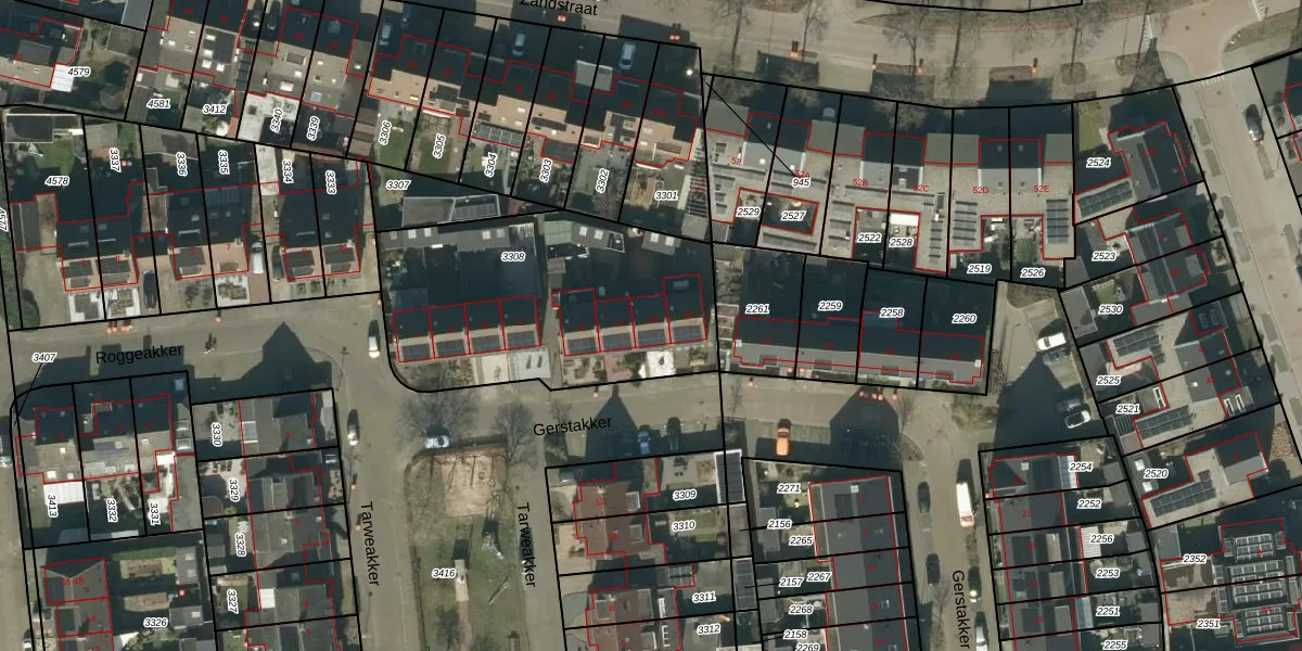 Het perceel waarop Gerstakker 13 staat heeft een oppervlakte van 1263 m². Dit is een zeer groot perceel. De perceeloppervlakte wordt geregistreerd door het Kadaster. Gedetailleerde informatie over de maten van dit perceel kunt u vinden in het rapport Kadastrale kaart met maatvoering van Gerstakker 13.
