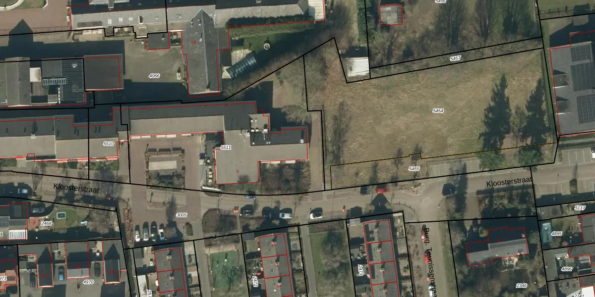 Het perceel waarop Kloosterstraat 5-A staat heeft een oppervlakte van 2185 m². Dit is een zeer groot perceel. De perceeloppervlakte wordt geregistreerd door het Kadaster. Gedetailleerde informatie over de maten van dit perceel kunt u vinden in het rapport Kadastrale kaart met maatvoering van Kloosterstraat 5-A.