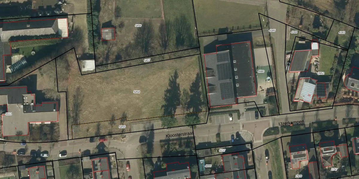 Kloosterstraat 57 is gelegen op kadastraal perceel NLD03B5454. Deze kadastrale aanduiding is uniek en wordt gebruikt door het Kadaster om eigendomsrechten en andere zakelijke rechten vast te leggen. Het perceel maakt onderdeel uit van de kadastrale gemeente Nuland.
