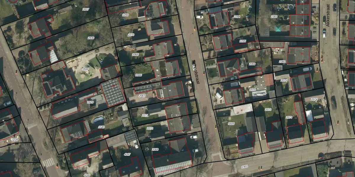 Schoolstraat 5 is gelegen op kadastraal perceel NLD03B2067. Deze kadastrale aanduiding is uniek en wordt gebruikt door het Kadaster om eigendomsrechten en andere zakelijke rechten vast te leggen. Het perceel maakt onderdeel uit van de kadastrale gemeente Nuland.