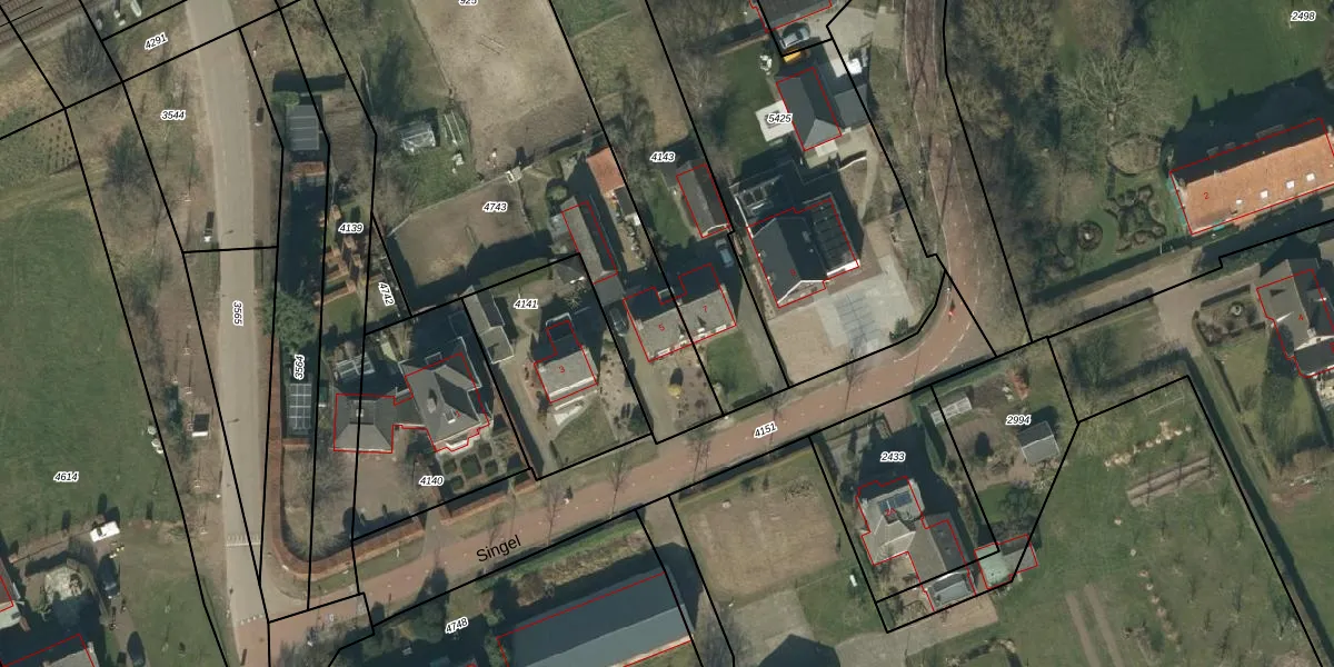 Het perceel waarop Singel 5 staat heeft een oppervlakte van 2129 m². Dit is een zeer groot perceel. De perceeloppervlakte wordt geregistreerd door het Kadaster. Gedetailleerde informatie over de maten van dit perceel kunt u vinden in het rapport Kadastrale kaart met maatvoering van Singel 5.