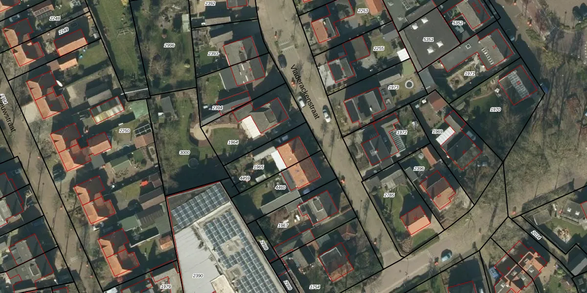 Vladerackenstraat 5 is gelegen op kadastraal perceel NLD03B1965. Deze kadastrale aanduiding is uniek en wordt gebruikt door het Kadaster om eigendomsrechten en andere zakelijke rechten vast te leggen. Het perceel maakt onderdeel uit van de kadastrale gemeente Nuland.