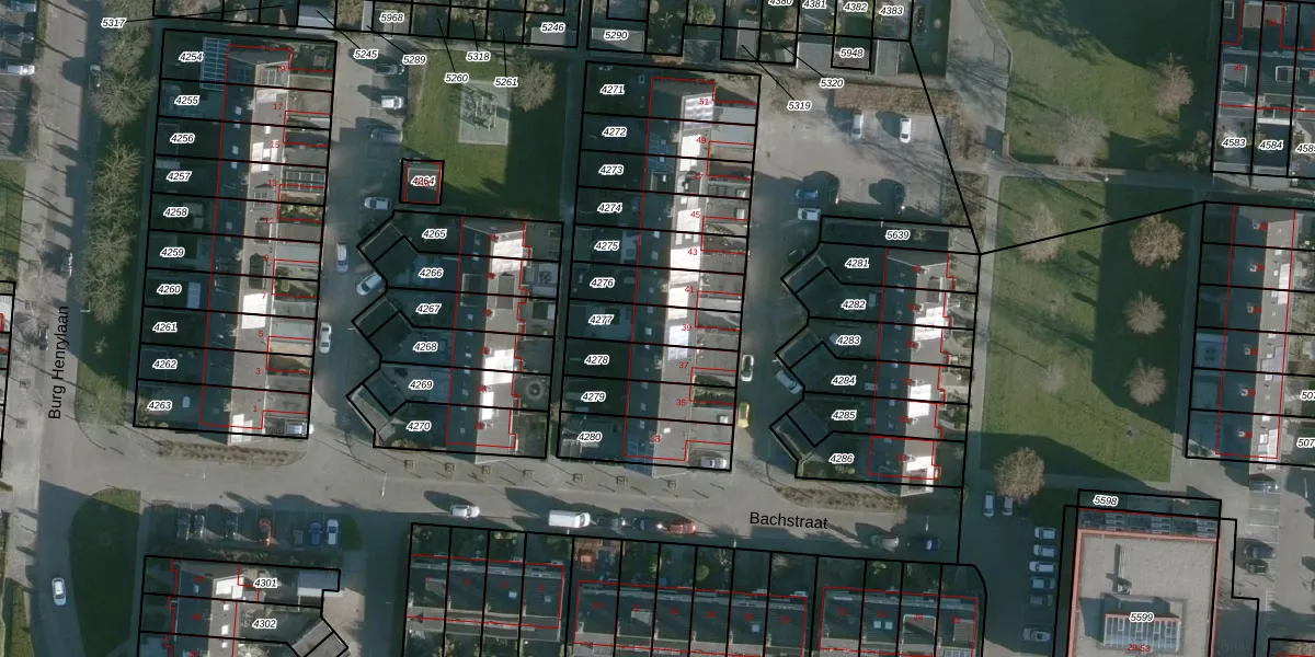 Bachstraat 39 is gelegen op kadastraal perceel NMD00B4277. Deze kadastrale aanduiding is uniek en wordt gebruikt door het Kadaster om eigendomsrechten en andere zakelijke rechten vast te leggen. Het perceel maakt onderdeel uit van de kadastrale gemeente Numansdorp.