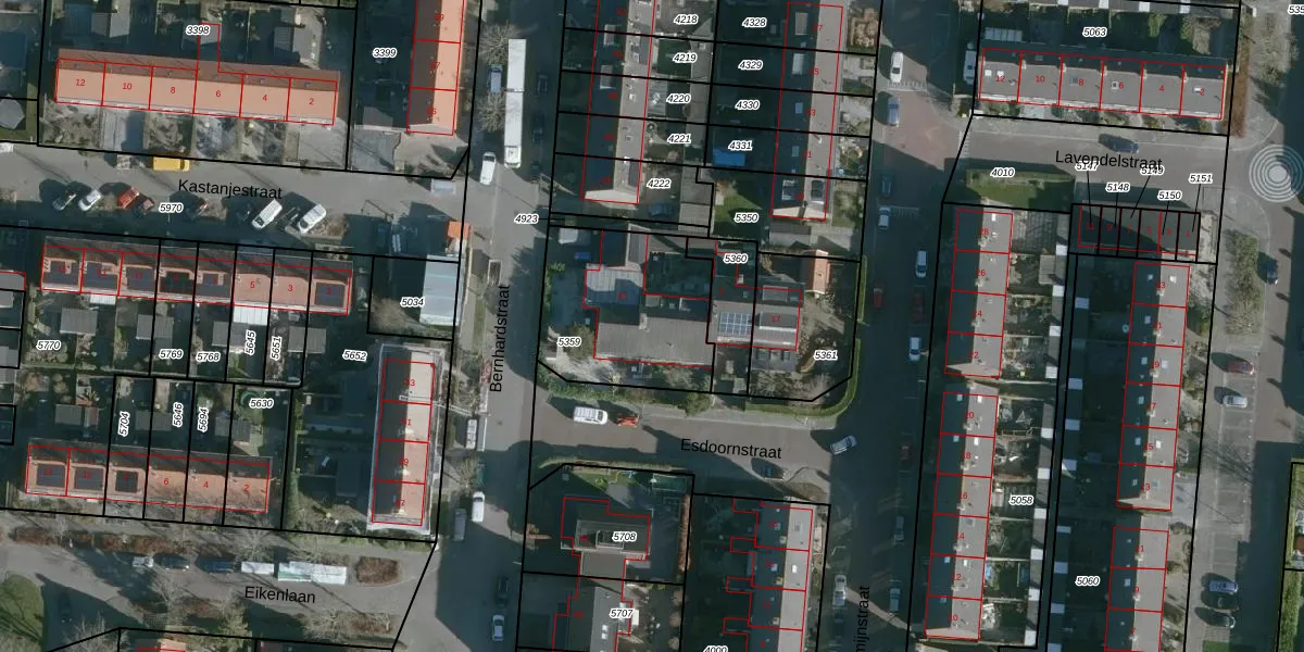 Het perceel waarop Bernhardstraat 42 staat heeft een oppervlakte van 584 m². Dit is een groot perceel. De perceeloppervlakte wordt geregistreerd door het Kadaster. Gedetailleerde informatie over de maten van dit perceel kunt u vinden in het rapport Kadastrale kaart met maatvoering van Bernhardstraat 42.