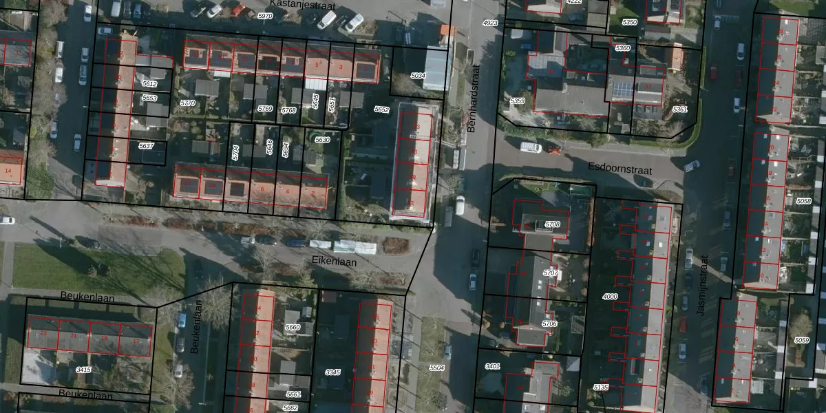 Het perceel waarop Bernhardstraat 57 staat heeft een oppervlakte van 842 m². Dit is een groot perceel. De perceeloppervlakte wordt geregistreerd door het Kadaster. Gedetailleerde informatie over de maten van dit perceel kunt u vinden in het rapport Kadastrale kaart met maatvoering van Bernhardstraat 57.