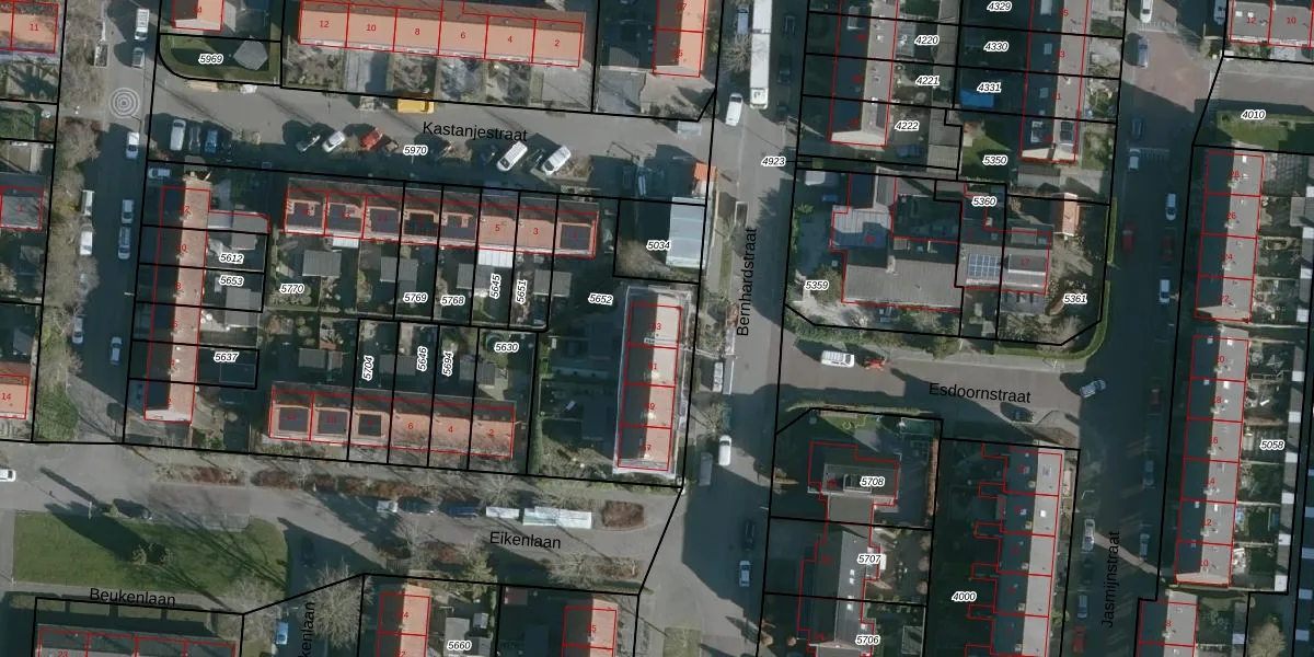 Het perceel waarop Bernhardstraat 63 staat heeft een oppervlakte van 842 m². Dit is een groot perceel. De perceeloppervlakte wordt geregistreerd door het Kadaster. Gedetailleerde informatie over de maten van dit perceel kunt u vinden in het rapport Kadastrale kaart met maatvoering van Bernhardstraat 63.