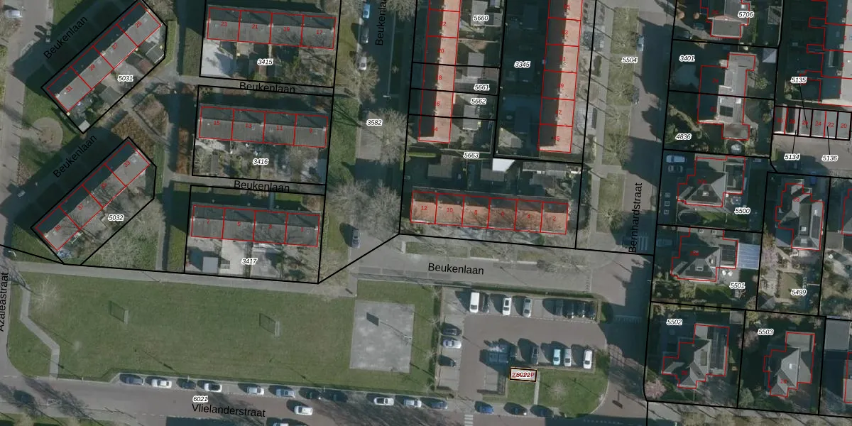 Het perceel waarop Beukenlaan 12 staat heeft een oppervlakte van 1000 m². Dit is een zeer groot perceel. De perceeloppervlakte wordt geregistreerd door het Kadaster. Gedetailleerde informatie over de maten van dit perceel kunt u vinden in het rapport Kadastrale kaart met maatvoering van Beukenlaan 12.