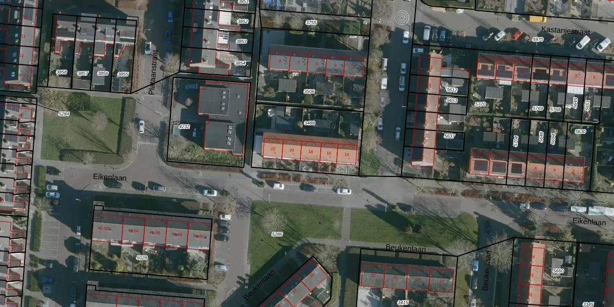 Het perceel waarop Eikenlaan 18 staat heeft een oppervlakte van 737 m². Dit is een groot perceel. De perceeloppervlakte wordt geregistreerd door het Kadaster. Gedetailleerde informatie over de maten van dit perceel kunt u vinden in het rapport Kadastrale kaart met maatvoering van Eikenlaan 18.