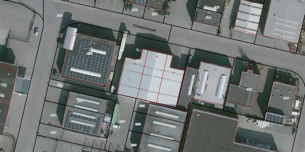 Het perceel waarop Einsteinstraat 14 staat heeft een oppervlakte van 1800 m². Dit is een zeer groot perceel. De perceeloppervlakte wordt geregistreerd door het Kadaster. Gedetailleerde informatie over de maten van dit perceel kunt u vinden in het rapport Kadastrale kaart met maatvoering van Einsteinstraat 14.