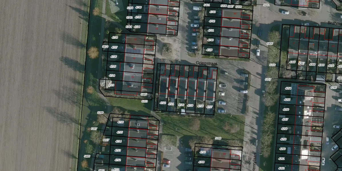 Griegstraat 9 is gelegen op kadastraal perceel NMD00B4721. Deze kadastrale aanduiding is uniek en wordt gebruikt door het Kadaster om eigendomsrechten en andere zakelijke rechten vast te leggen. Het perceel maakt onderdeel uit van de kadastrale gemeente Numansdorp.