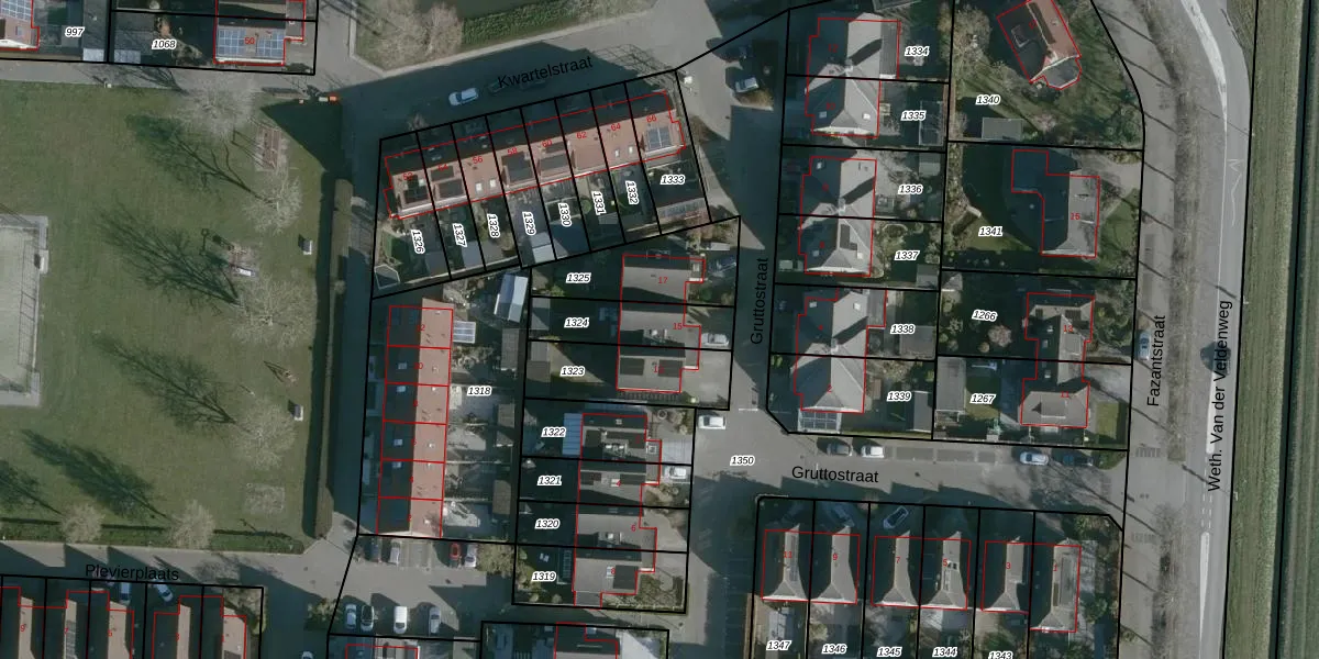 Gruttostraat 15 is gelegen op kadastraal perceel NMD00F1324. Deze kadastrale aanduiding is uniek en wordt gebruikt door het Kadaster om eigendomsrechten en andere zakelijke rechten vast te leggen. Het perceel maakt onderdeel uit van de kadastrale gemeente Numansdorp.