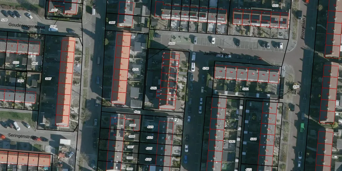 Het perceel waarop Jasmijnstraat 45 staat heeft een oppervlakte van 853 m². Dit is een groot perceel. De perceeloppervlakte wordt geregistreerd door het Kadaster. Gedetailleerde informatie over de maten van dit perceel kunt u vinden in het rapport Kadastrale kaart met maatvoering van Jasmijnstraat 45.