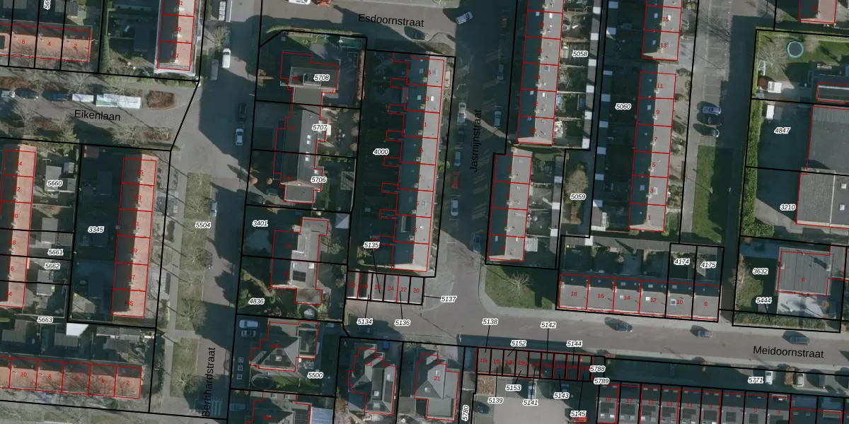 Jasmijnstraat 5 is gelegen op kadastraal perceel NMD00B4000. Deze kadastrale aanduiding is uniek en wordt gebruikt door het Kadaster om eigendomsrechten en andere zakelijke rechten vast te leggen. Het perceel maakt onderdeel uit van de kadastrale gemeente Numansdorp.