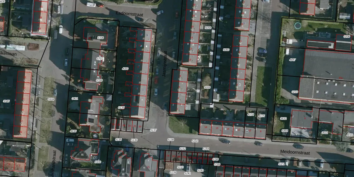Het perceel waarop Jasmijnstraat 6 staat heeft een oppervlakte van 1800 m². Dit is een zeer groot perceel. De perceeloppervlakte wordt geregistreerd door het Kadaster. Gedetailleerde informatie over de maten van dit perceel kunt u vinden in het rapport Kadastrale kaart met maatvoering van Jasmijnstraat 6.