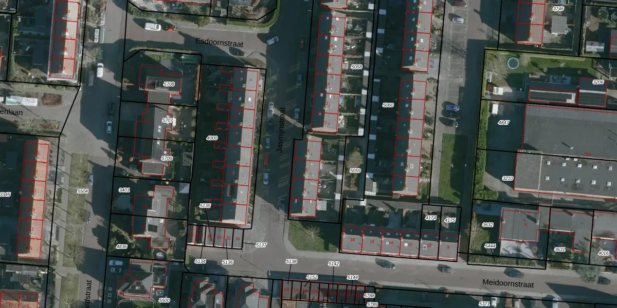 Het perceel waarop Jasmijnstraat 8 staat heeft een oppervlakte van 1800 m². Dit is een zeer groot perceel. De perceeloppervlakte wordt geregistreerd door het Kadaster. Gedetailleerde informatie over de maten van dit perceel kunt u vinden in het rapport Kadastrale kaart met maatvoering van Jasmijnstraat 8.