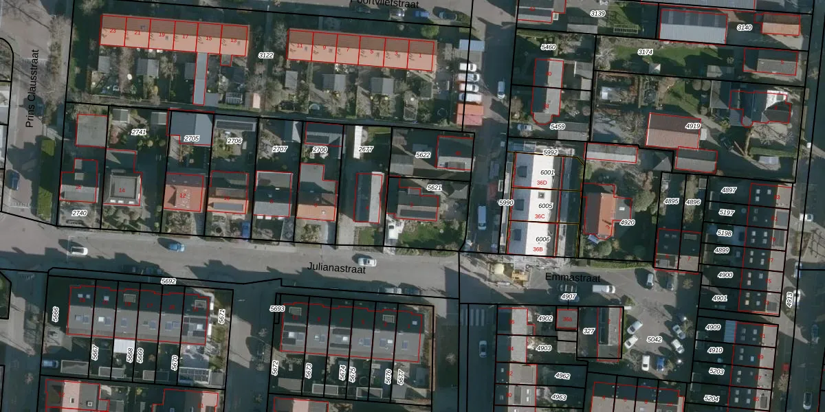 Het perceel waarop Julianastraat 2 staat heeft een oppervlakte van 338 m². Dit is een groot perceel. De perceeloppervlakte wordt geregistreerd door het Kadaster. Gedetailleerde informatie over de maten van dit perceel kunt u vinden in het rapport Kadastrale kaart met maatvoering van Julianastraat 2.