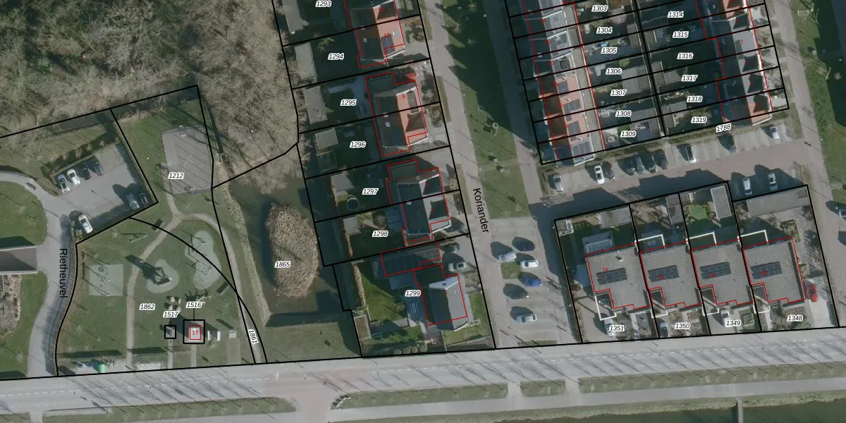 Het perceel waarop Koriander 3 staat heeft een oppervlakte van 376 m². Dit is een groot perceel. De perceeloppervlakte wordt geregistreerd door het Kadaster. Gedetailleerde informatie over de maten van dit perceel kunt u vinden in het rapport Kadastrale kaart met maatvoering van Koriander 3.