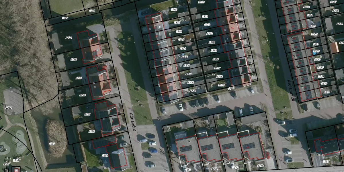 Het perceel waarop Koriander 4 staat heeft een oppervlakte van 153 m². Dit is een middelgroot perceel. De perceeloppervlakte wordt geregistreerd door het Kadaster. Gedetailleerde informatie over de maten van dit perceel kunt u vinden in het rapport Kadastrale kaart met maatvoering van Koriander 4.