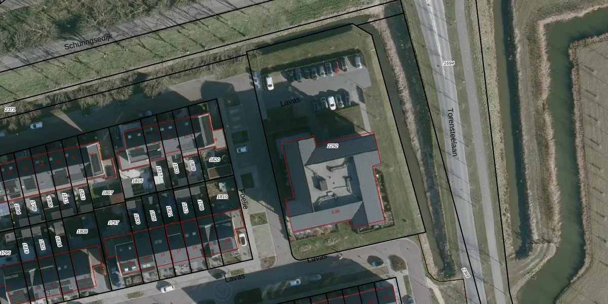 Het perceel waarop Lavas 22 staat heeft een oppervlakte van 3055 m². Dit is een zeer groot perceel. De perceeloppervlakte wordt geregistreerd door het Kadaster. Gedetailleerde informatie over de maten van dit perceel kunt u vinden in het rapport Kadastrale kaart met maatvoering van Lavas 22.