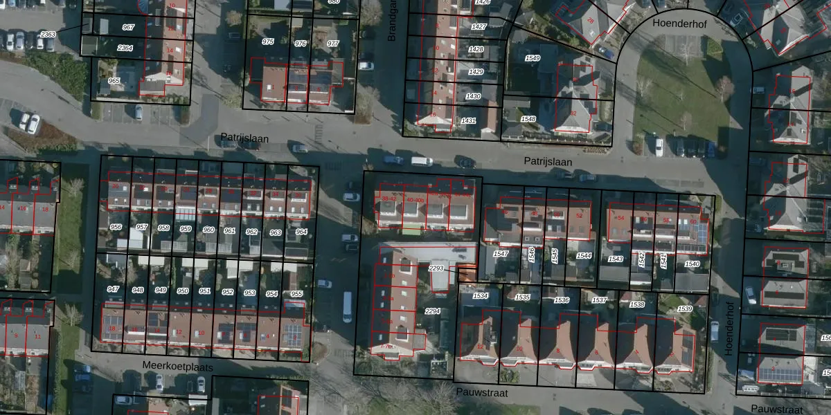 Het perceel waarop Patrijslaan 38-b staat heeft een oppervlakte van 1272 m². Dit is een zeer groot perceel. De perceeloppervlakte wordt geregistreerd door het Kadaster. Gedetailleerde informatie over de maten van dit perceel kunt u vinden in het rapport Kadastrale kaart met maatvoering van Patrijslaan 38-b.