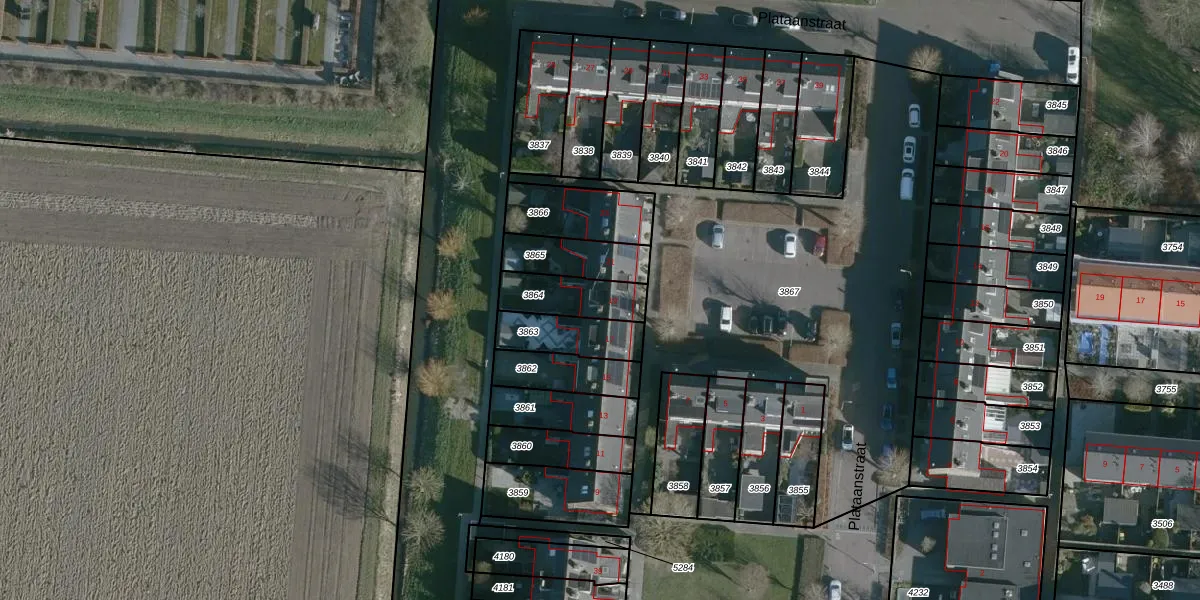Plataanstraat 19 is gelegen op kadastraal perceel NMD00B3864. Deze kadastrale aanduiding is uniek en wordt gebruikt door het Kadaster om eigendomsrechten en andere zakelijke rechten vast te leggen. Het perceel maakt onderdeel uit van de kadastrale gemeente Numansdorp.