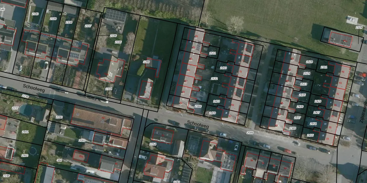 Het perceel waarop Schoolweg 55 staat heeft een oppervlakte van 1253 m². Dit is een zeer groot perceel. De perceeloppervlakte wordt geregistreerd door het Kadaster. Gedetailleerde informatie over de maten van dit perceel kunt u vinden in het rapport Kadastrale kaart met maatvoering van Schoolweg 55.