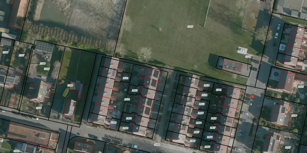Het perceel waarop Schoolweg 79 staat heeft een oppervlakte van 1253 m². Dit is een zeer groot perceel. De perceeloppervlakte wordt geregistreerd door het Kadaster. Gedetailleerde informatie over de maten van dit perceel kunt u vinden in het rapport Kadastrale kaart met maatvoering van Schoolweg 79.