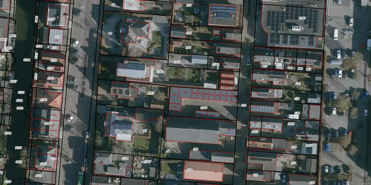 Het perceel waarop Torenstraat 65-i staat heeft een oppervlakte van 589 m². Dit is een groot perceel. De perceeloppervlakte wordt geregistreerd door het Kadaster. Gedetailleerde informatie over de maten van dit perceel kunt u vinden in het rapport Kadastrale kaart met maatvoering van Torenstraat 65-i.