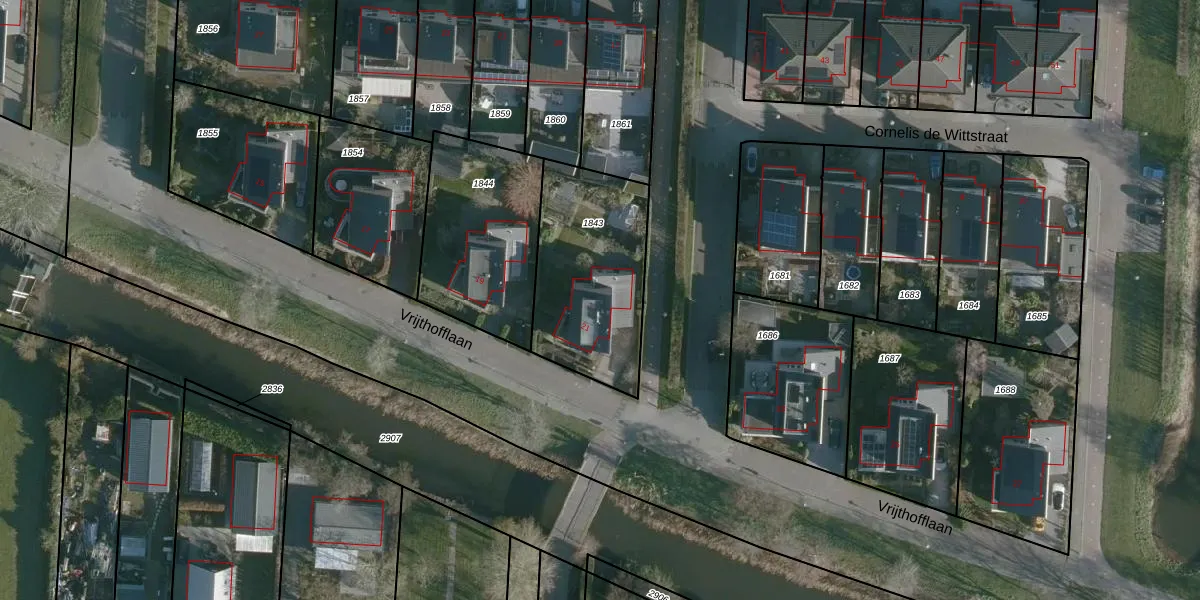 Het perceel waarop Vrijthofflaan 21 staat heeft een oppervlakte van 616 m². Dit is een groot perceel. De perceeloppervlakte wordt geregistreerd door het Kadaster. Gedetailleerde informatie over de maten van dit perceel kunt u vinden in het rapport Kadastrale kaart met maatvoering van Vrijthofflaan 21.