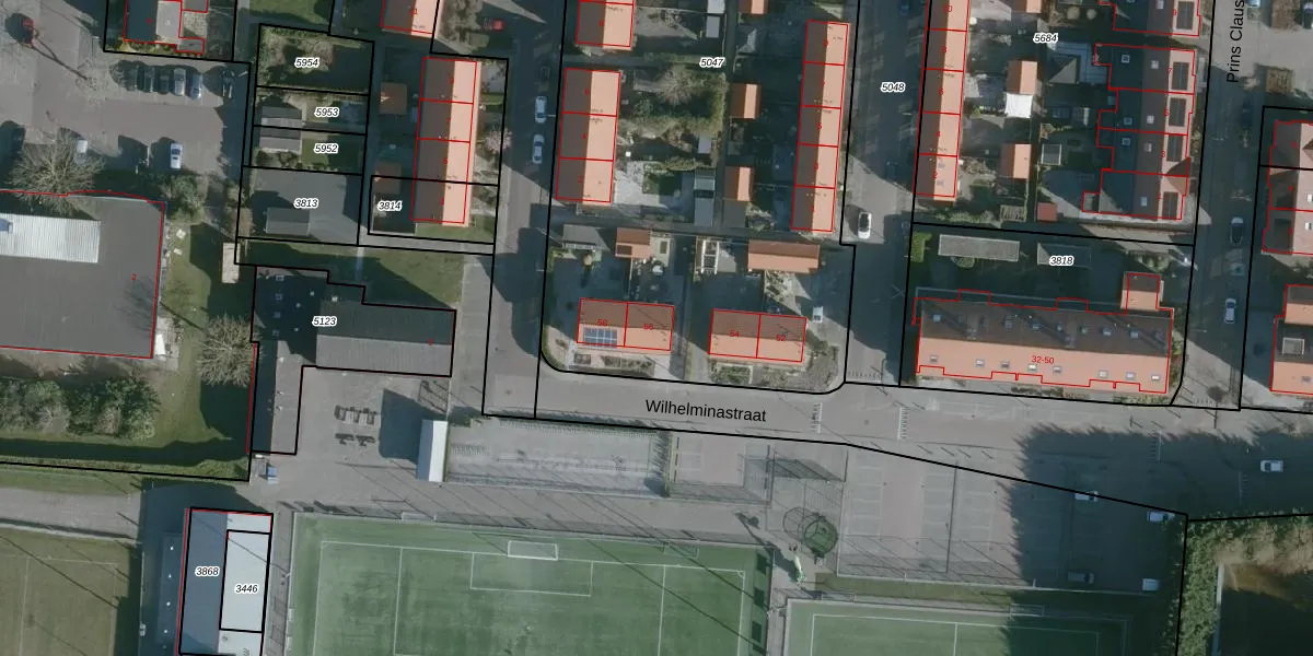 Het perceel waarop Wilhelminastraat 56 staat heeft een oppervlakte van 4948 m². Dit is een zeer groot perceel. De perceeloppervlakte wordt geregistreerd door het Kadaster. Gedetailleerde informatie over de maten van dit perceel kunt u vinden in het rapport Kadastrale kaart met maatvoering van Wilhelminastraat 56.