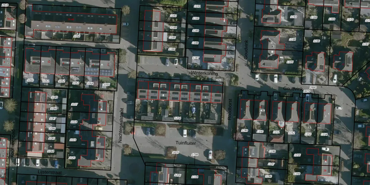 Het perceel waarop Winterkoning 9 staat heeft een oppervlakte van 1080 m². Dit is een zeer groot perceel. De perceeloppervlakte wordt geregistreerd door het Kadaster. Gedetailleerde informatie over de maten van dit perceel kunt u vinden in het rapport Kadastrale kaart met maatvoering van Winterkoning 9.