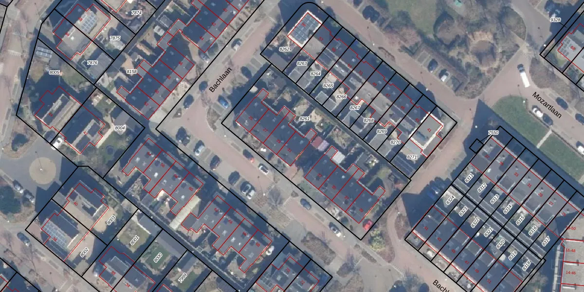 Het perceel waarop Bachlaan 31 staat heeft een oppervlakte van 1665 m². Dit is een zeer groot perceel. De perceeloppervlakte wordt geregistreerd door het Kadaster. Gedetailleerde informatie over de maten van dit perceel kunt u vinden in het rapport Kadastrale kaart met maatvoering van Bachlaan 31.