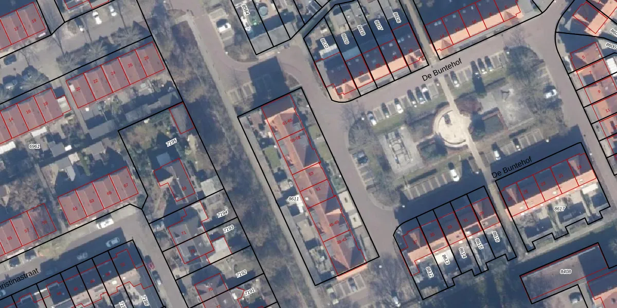 Het perceel waarop De Buntehof 59 staat heeft een oppervlakte van 1376 m². Dit is een zeer groot perceel. De perceeloppervlakte wordt geregistreerd door het Kadaster. Gedetailleerde informatie over de maten van dit perceel kunt u vinden in het rapport Kadastrale kaart met maatvoering van De Buntehof 59.