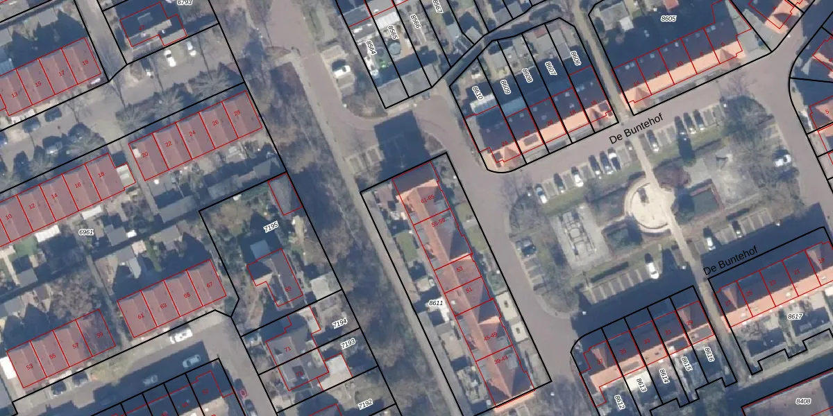 Het perceel waarop De Buntehof 61 staat heeft een oppervlakte van 1376 m². Dit is een zeer groot perceel. De perceeloppervlakte wordt geregistreerd door het Kadaster. Gedetailleerde informatie over de maten van dit perceel kunt u vinden in het rapport Kadastrale kaart met maatvoering van De Buntehof 61.