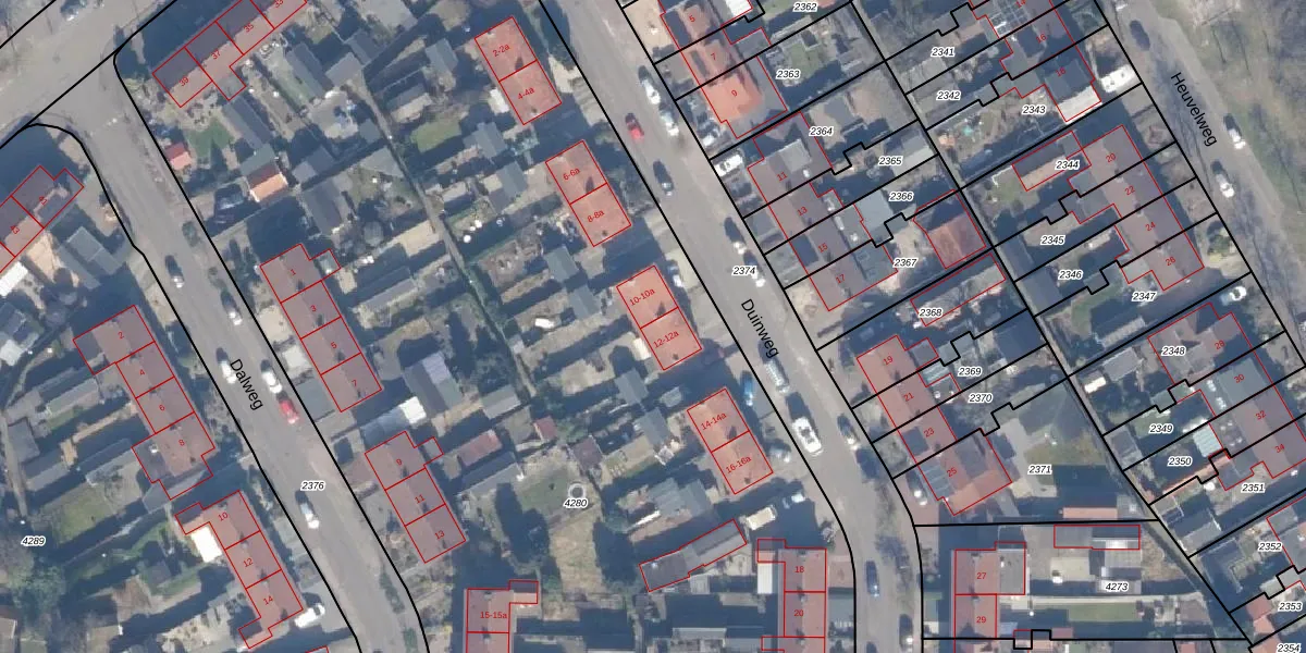 Het perceel waarop Duinweg 12-a staat heeft een oppervlakte van 8864 m². Dit is een zeer groot perceel. De perceeloppervlakte wordt geregistreerd door het Kadaster. Gedetailleerde informatie over de maten van dit perceel kunt u vinden in het rapport Kadastrale kaart met maatvoering van Duinweg 12-a.