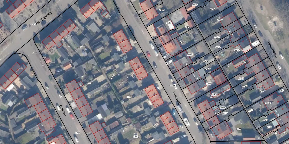 Het perceel waarop Duinweg 8 staat heeft een oppervlakte van 8864 m². Dit is een zeer groot perceel. De perceeloppervlakte wordt geregistreerd door het Kadaster. Gedetailleerde informatie over de maten van dit perceel kunt u vinden in het rapport Kadastrale kaart met maatvoering van Duinweg 8.