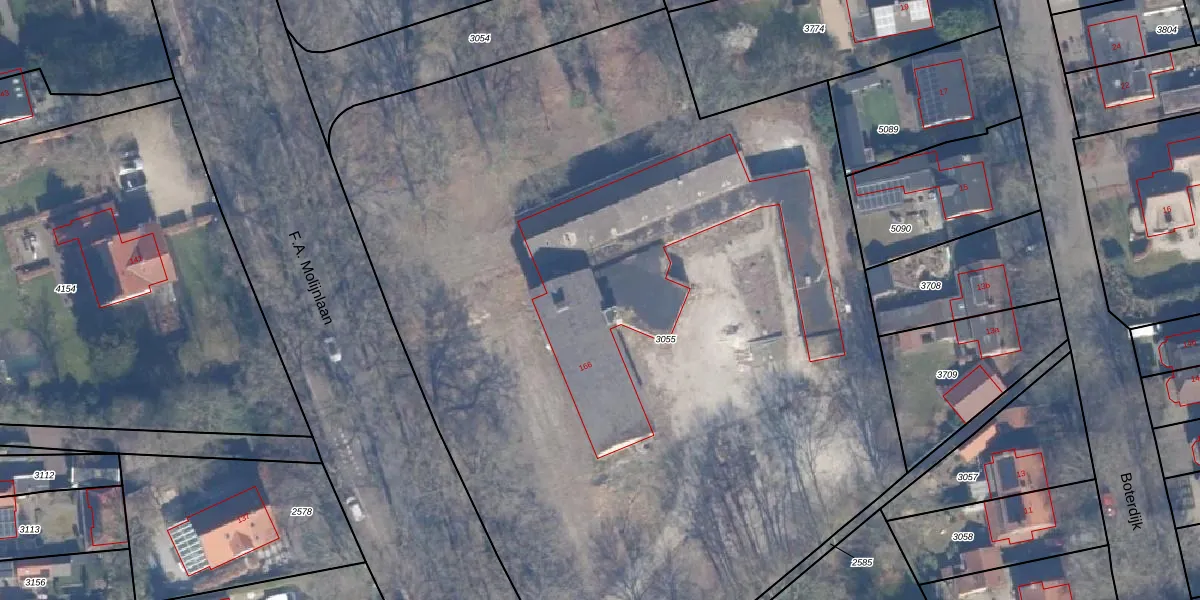 Het perceel waarop F.A. Molijnlaan 160-0004 staat heeft een oppervlakte van 7100 m². Dit is een zeer groot perceel. De perceeloppervlakte wordt geregistreerd door het Kadaster. Gedetailleerde informatie over de maten van dit perceel kunt u vinden in het rapport Kadastrale kaart met maatvoering van F.A. Molijnlaan 160-0004.