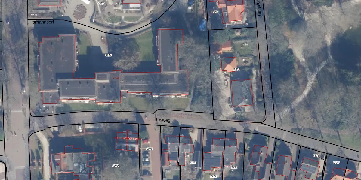 Het perceel waarop Ittmannserf 32 staat heeft een oppervlakte van 5192 m². Dit is een zeer groot perceel. De perceeloppervlakte wordt geregistreerd door het Kadaster. Gedetailleerde informatie over de maten van dit perceel kunt u vinden in het rapport Kadastrale kaart met maatvoering van Ittmannserf 32.