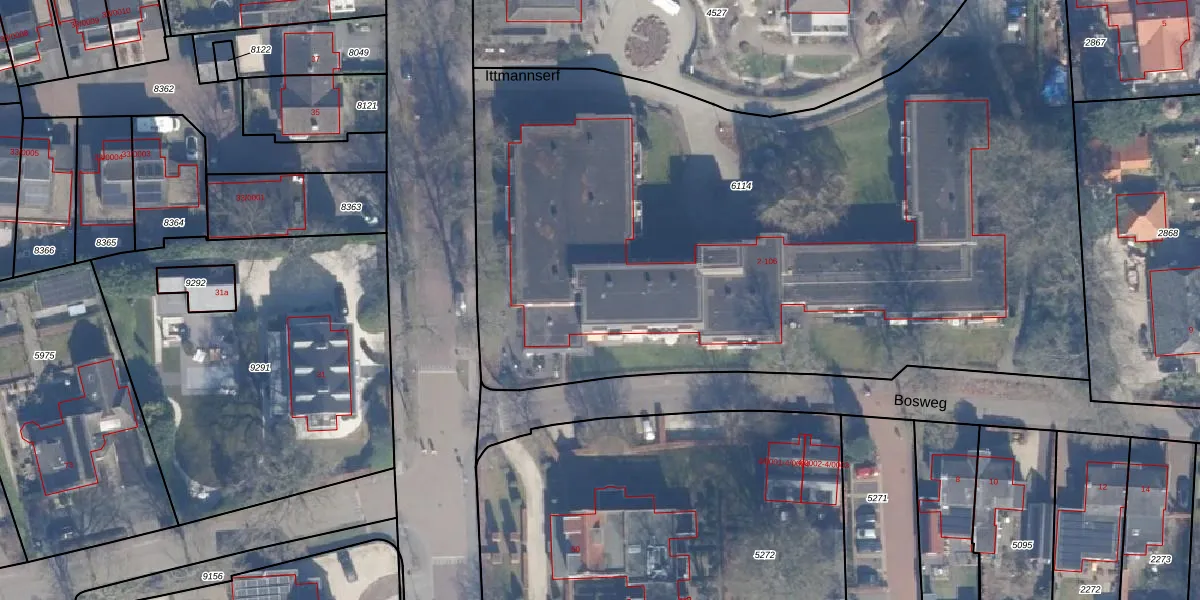 Het perceel waarop Ittmannserf 50 staat heeft een oppervlakte van 5192 m². Dit is een zeer groot perceel. De perceeloppervlakte wordt geregistreerd door het Kadaster. Gedetailleerde informatie over de maten van dit perceel kunt u vinden in het rapport Kadastrale kaart met maatvoering van Ittmannserf 50.