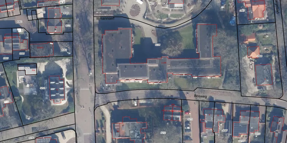 Het perceel waarop Ittmannserf 54 staat heeft een oppervlakte van 5192 m². Dit is een zeer groot perceel. De perceeloppervlakte wordt geregistreerd door het Kadaster. Gedetailleerde informatie over de maten van dit perceel kunt u vinden in het rapport Kadastrale kaart met maatvoering van Ittmannserf 54.