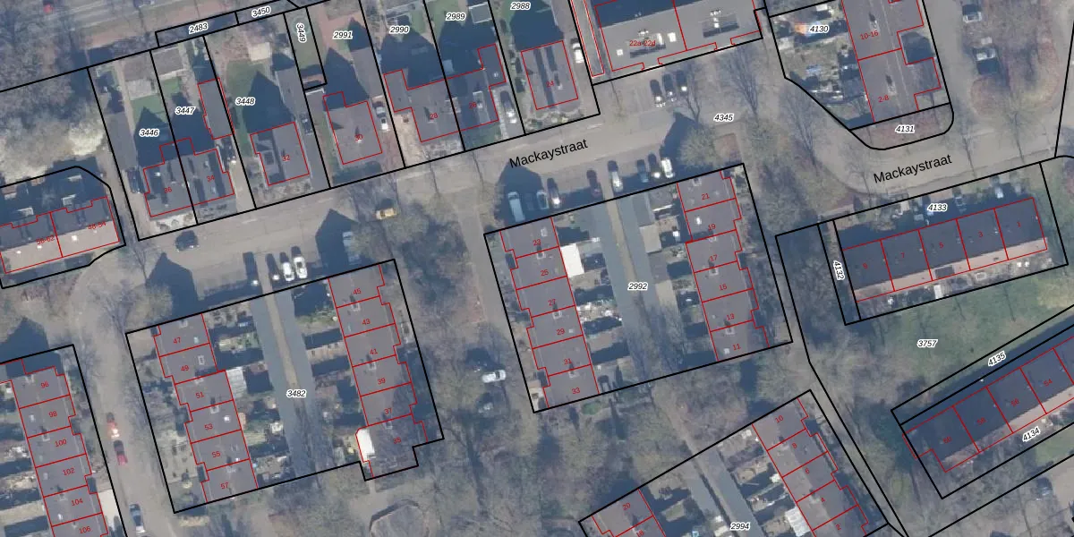 Het perceel waarop Mackaystraat 25 staat heeft een oppervlakte van 1721 m². Dit is een zeer groot perceel. De perceeloppervlakte wordt geregistreerd door het Kadaster. Gedetailleerde informatie over de maten van dit perceel kunt u vinden in het rapport Kadastrale kaart met maatvoering van Mackaystraat 25.