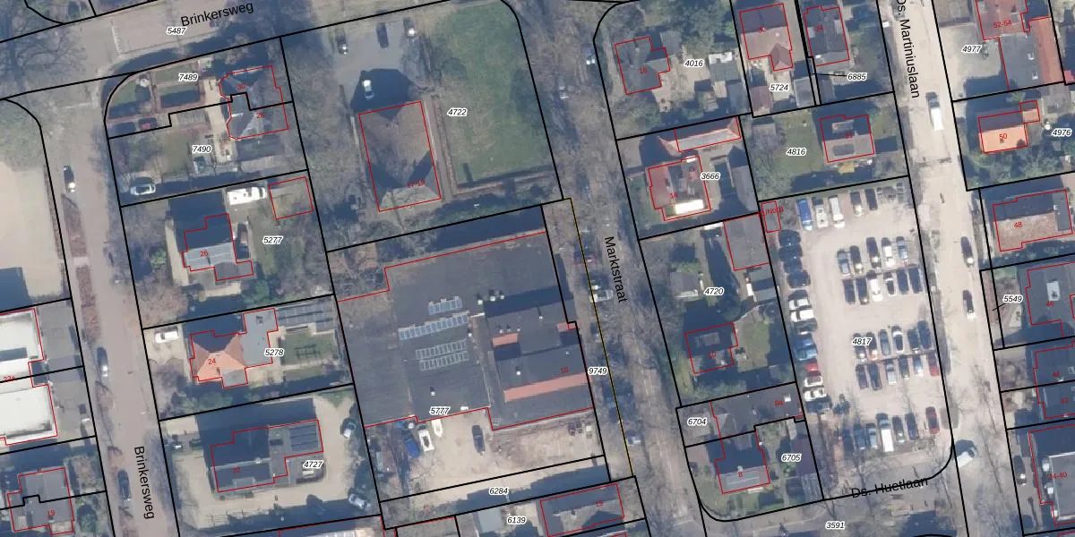 Het perceel waarop Marktstraat 15-q staat heeft een oppervlakte van 2045 m². Dit is een zeer groot perceel. De perceeloppervlakte wordt geregistreerd door het Kadaster. Gedetailleerde informatie over de maten van dit perceel kunt u vinden in het rapport Kadastrale kaart met maatvoering van Marktstraat 15-q.