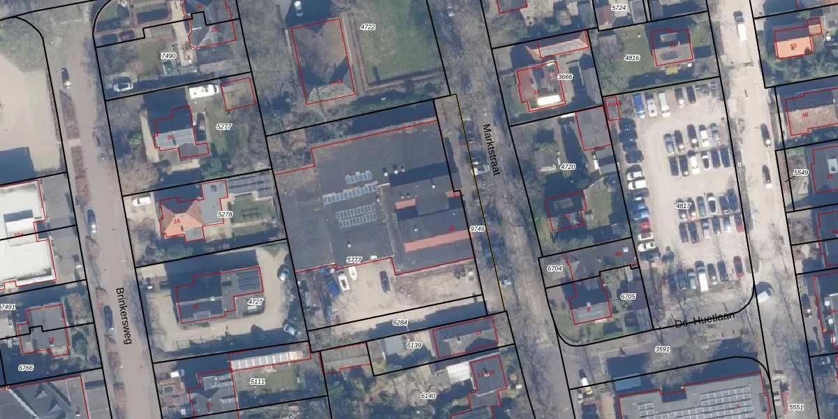 Het perceel waarop Marktstraat 15-r staat heeft een oppervlakte van 2045 m². Dit is een zeer groot perceel. De perceeloppervlakte wordt geregistreerd door het Kadaster. Gedetailleerde informatie over de maten van dit perceel kunt u vinden in het rapport Kadastrale kaart met maatvoering van Marktstraat 15-r.