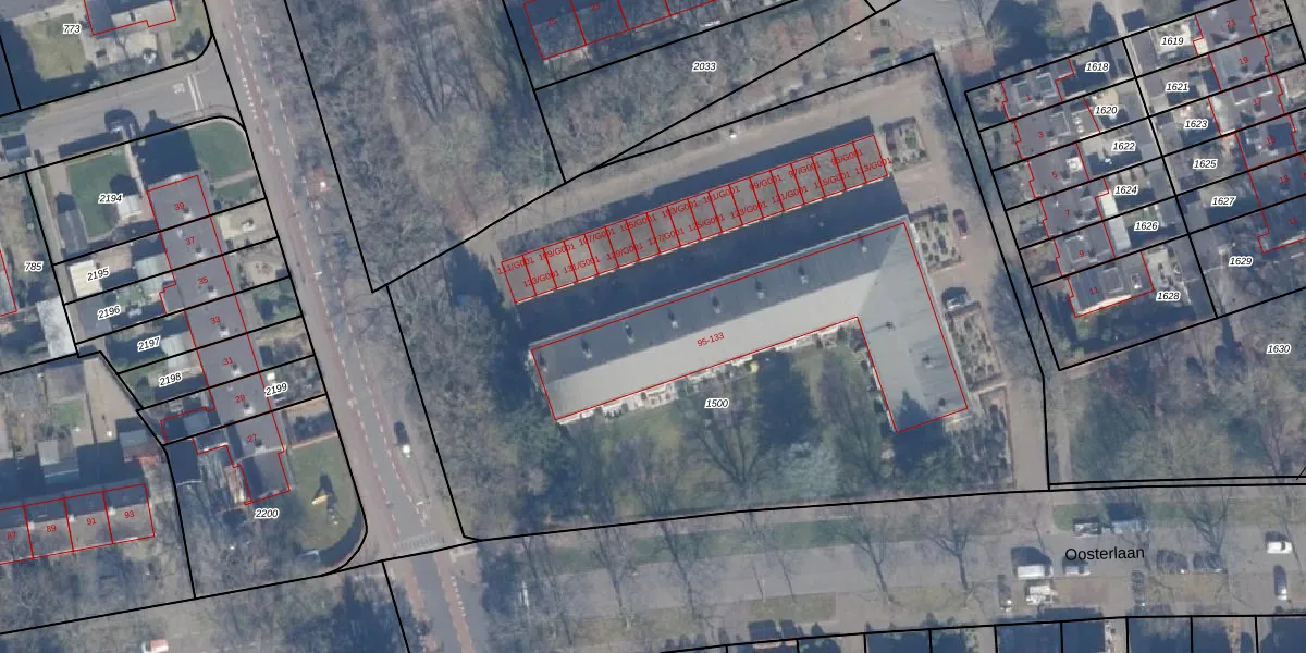 Het perceel waarop Oosterlaan 107 staat heeft een oppervlakte van 5131 m². Dit is een zeer groot perceel. De perceeloppervlakte wordt geregistreerd door het Kadaster. Gedetailleerde informatie over de maten van dit perceel kunt u vinden in het rapport Kadastrale kaart met maatvoering van Oosterlaan 107.