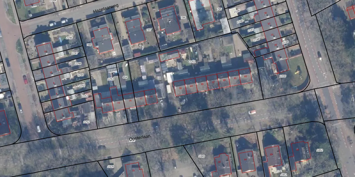 Het perceel waarop Oosterlaan 81 staat heeft een oppervlakte van 2630 m². Dit is een zeer groot perceel. De perceeloppervlakte wordt geregistreerd door het Kadaster. Gedetailleerde informatie over de maten van dit perceel kunt u vinden in het rapport Kadastrale kaart met maatvoering van Oosterlaan 81.