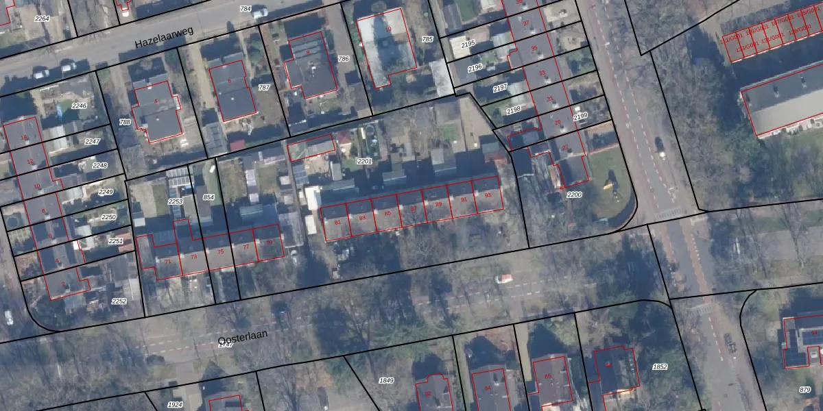 Het perceel waarop Oosterlaan 87 staat heeft een oppervlakte van 2630 m². Dit is een zeer groot perceel. De perceeloppervlakte wordt geregistreerd door het Kadaster. Gedetailleerde informatie over de maten van dit perceel kunt u vinden in het rapport Kadastrale kaart met maatvoering van Oosterlaan 87.