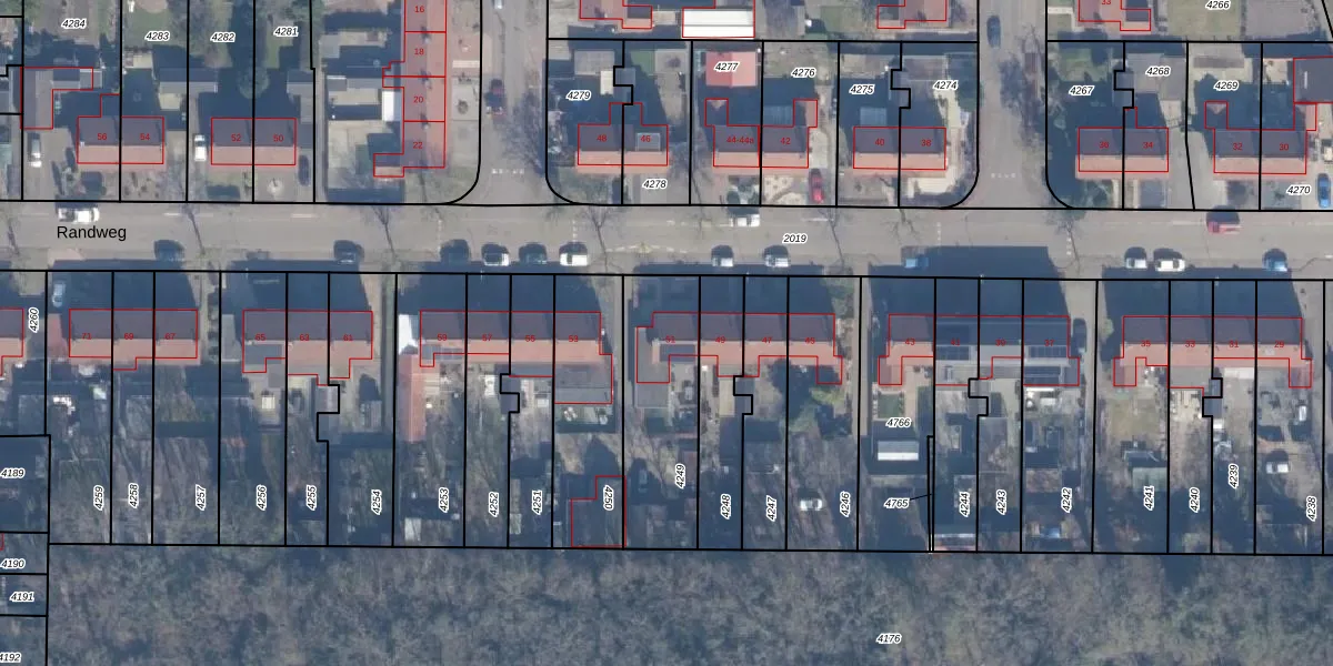 Het perceel waarop Randweg 51 staat heeft een oppervlakte van 470 m². Dit is een groot perceel. De perceeloppervlakte wordt geregistreerd door het Kadaster. Gedetailleerde informatie over de maten van dit perceel kunt u vinden in het rapport Kadastrale kaart met maatvoering van Randweg 51.
